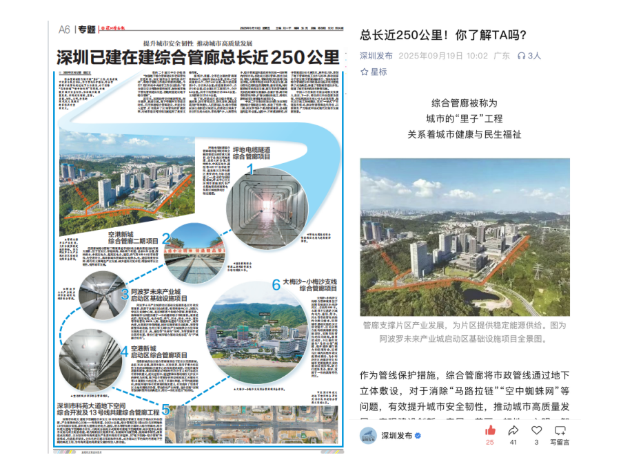 管廊總長近250公里”為題,在A6專題整版報道了深圳二十冶承建的多個管廊項目。“深圳發布”(深圳市人民政府新聞辦公室)以“總長度近250公里!你了解TA嗎?”為題迅速轉發。