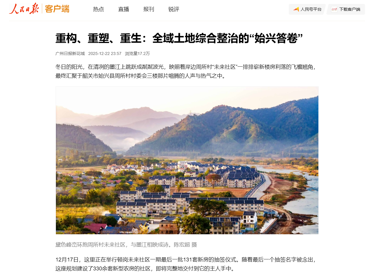 12月22日,《人民日?qǐng)?bào)》客戶端以《重構(gòu)、重塑、重生:全域土地綜合整治的“始興答卷”》為題,對(duì)深圳二十冶承建的始興縣頓崗鎮(zhèn)全域土地綜合整治(鄉(xiāng)村空間“三提三化”)項(xiàng)目進(jìn)行了報(bào)道。
