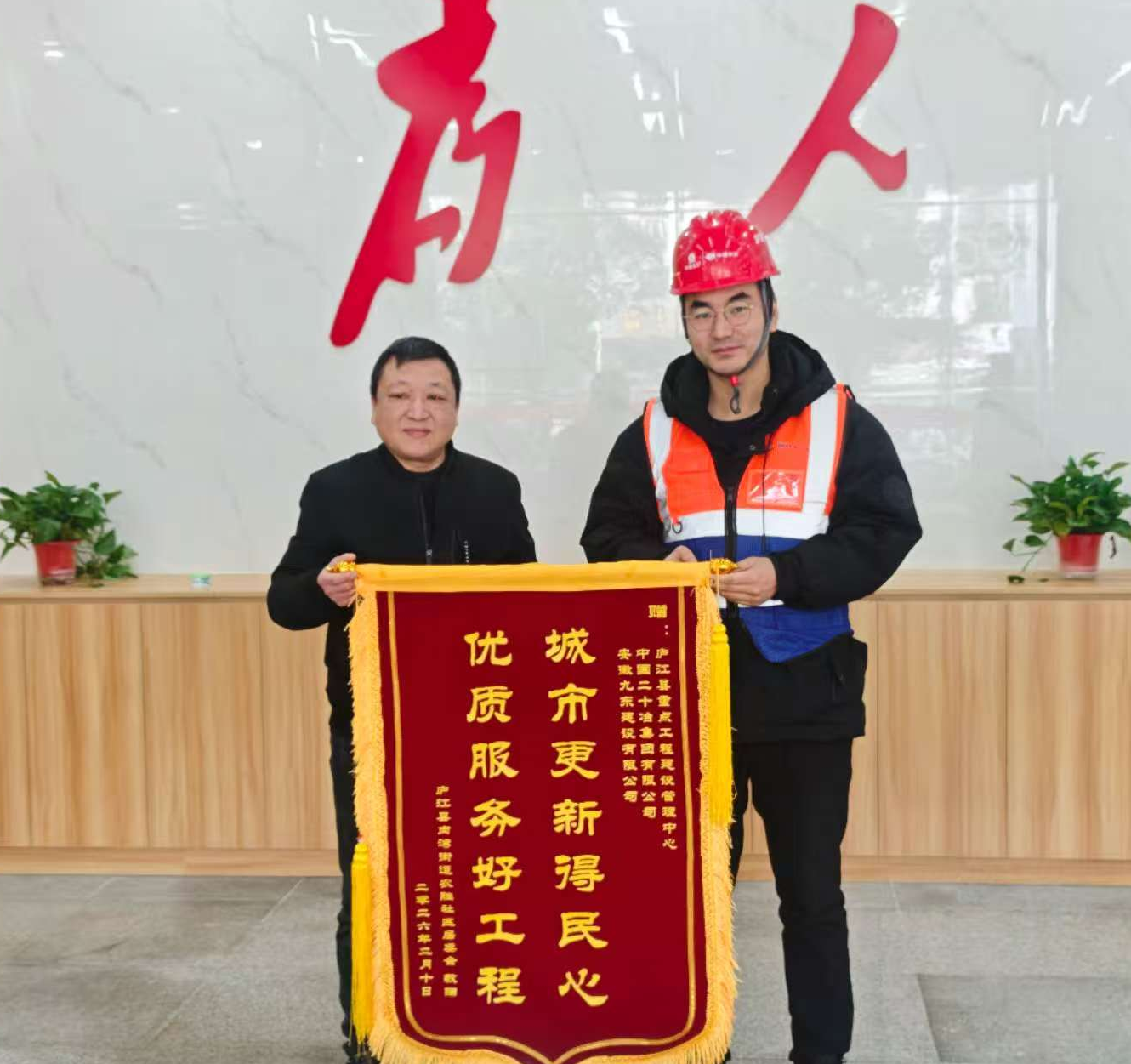 2月10日,安徽二十冶承建的廬江縣城北片區城市更新項目—周瑜墓片區EPCO工程總承包項目部,收到了社居委贈送的錦旗。錦旗上“城市更新得民心 優質服務好工程”的字樣,既是社區對項目建設的高度認可,也是項目民生服務工作深入人心的生動體現。
