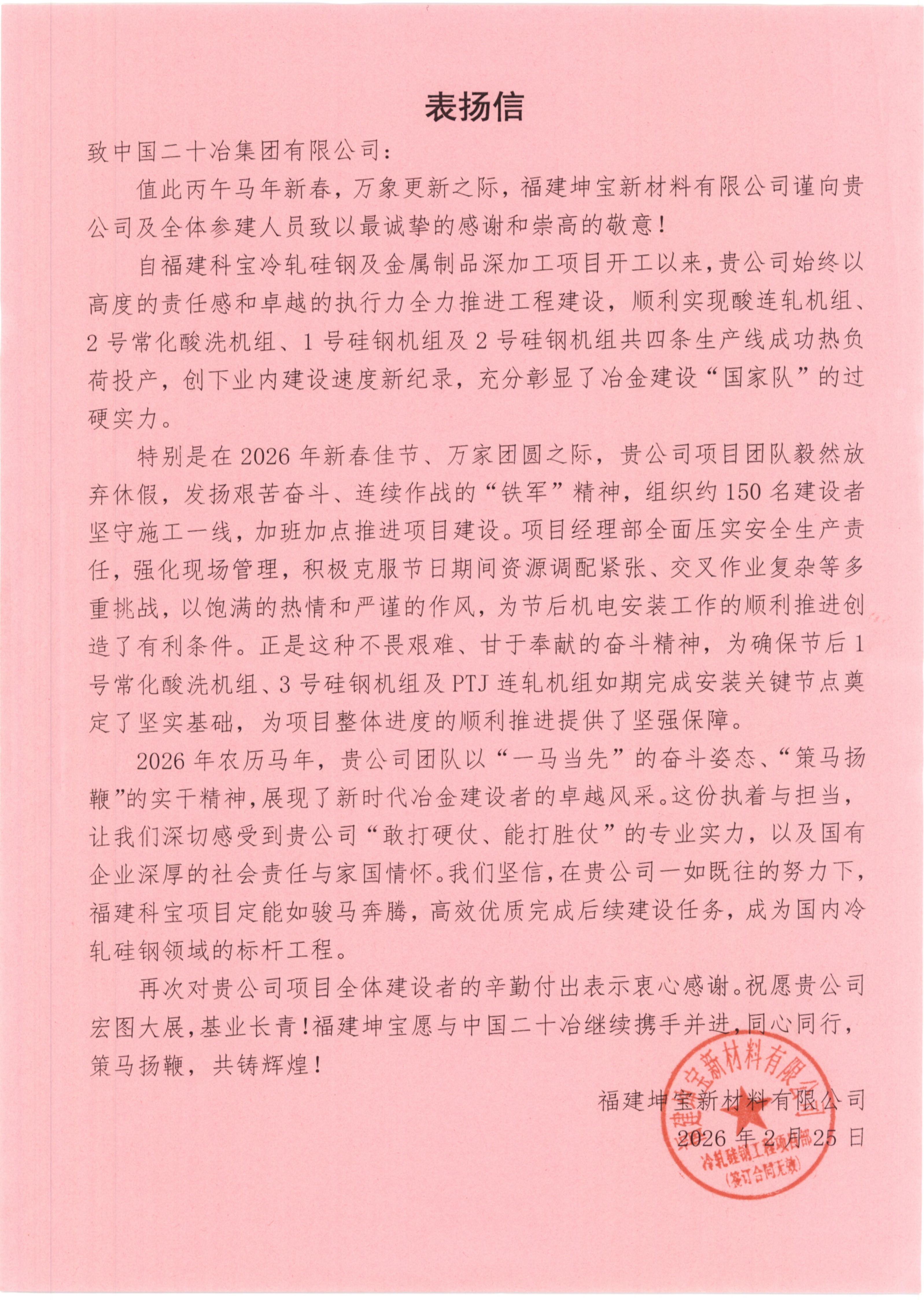 3月5日,由冶金工業(yè)公司承建的福建科寶冷軋硅鋼及金屬制品深加工項目收到業(yè)主福建坤寶新材料有限公司發(fā)來的表揚信,對項目團隊在工程建設(shè)中的卓越表現(xiàn)和春節(jié)期間的堅守奉獻表示衷心感謝和崇高敬意。
