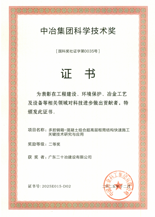 3月10日,廣東二十冶收到中國中冶頒發的“中冶集團科學技術獎”證書。在此前公布的中國中冶科技成果評價中,該課題已被專家組認定為達到“國際領先”水平。